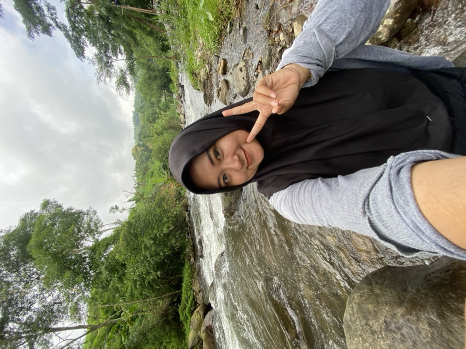 A woman wearing a black hijab and grey shirt makes a peace sign while sitting beside a rushing river. Green trees and foliage line the riverbank under a cloudy sky. The photo is taken at an angle, with the river flowing diagonally across the frame. A large rock is visible in the foreground.