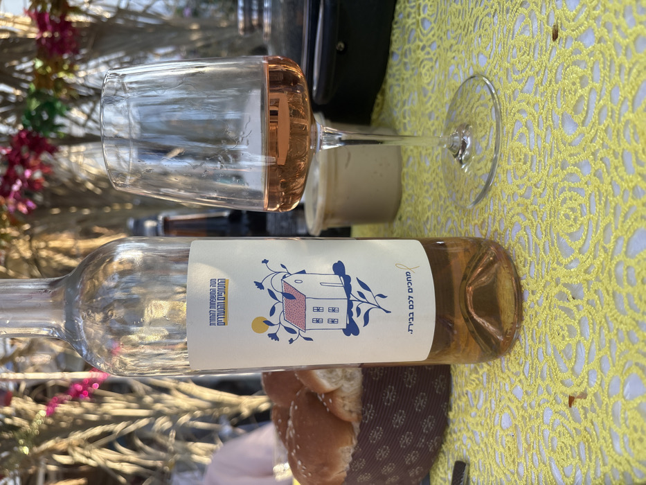 The image presents an outdoor table setting in Ramat HaSharon, Israel, under natural daylight. A clear glass bottle, containing rosé wine, is positioned centrally on a yellow, intricately patterned or crocheted tablecloth. The bottle's label features a stylized illustration of a white house with a pink roof, blue windows, and a blue door, framed by blue-green foliage and a yellow sun/moon graphic. Hebrew text on the label identifies it as "מטה המשפחות להחזרת החטופים והנעדרים" (Headquarters of the Families for the Return of the Abducted and Missing) and "מחכים לכם בבית." (Waiting for you at home). To the right of the bottle, a clear stemmed wine glass holds rosé wine. To the left, a woven paper basket contains several sesame-seeded bread rolls. The blurred background includes vertical arrangements of dried reeds or straw, interspersed with artificial flowers in pink, red, green, and blue hues. Other indistinct background elements consist of additional bottles and containers, with a partial view of an individual's arm on the far left.