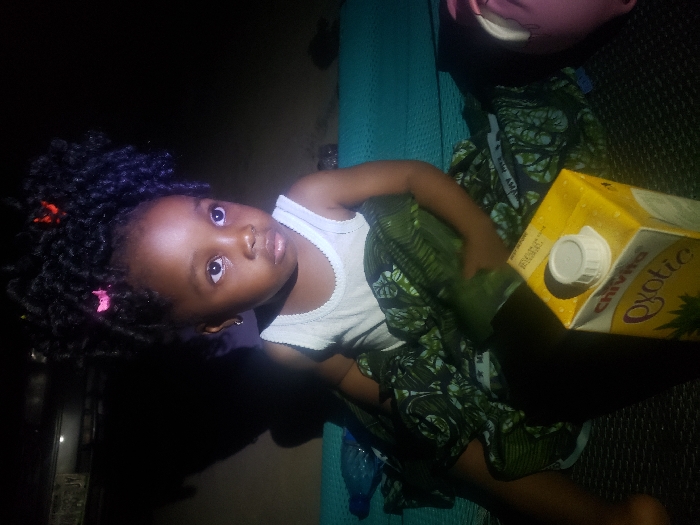 A young child with curly hair, adorned with pink clips, gazes upward. The child wears a white tank top and is draped in a green patterned fabric. A yellow juice box, labeled "Chivita Exotic," sits beside the child. A pink object is visible in the upper corner, and a blue object is on the ground. The lighting is dim, creating shadows around the scene. The composition is taken at a slightly angled perspective.