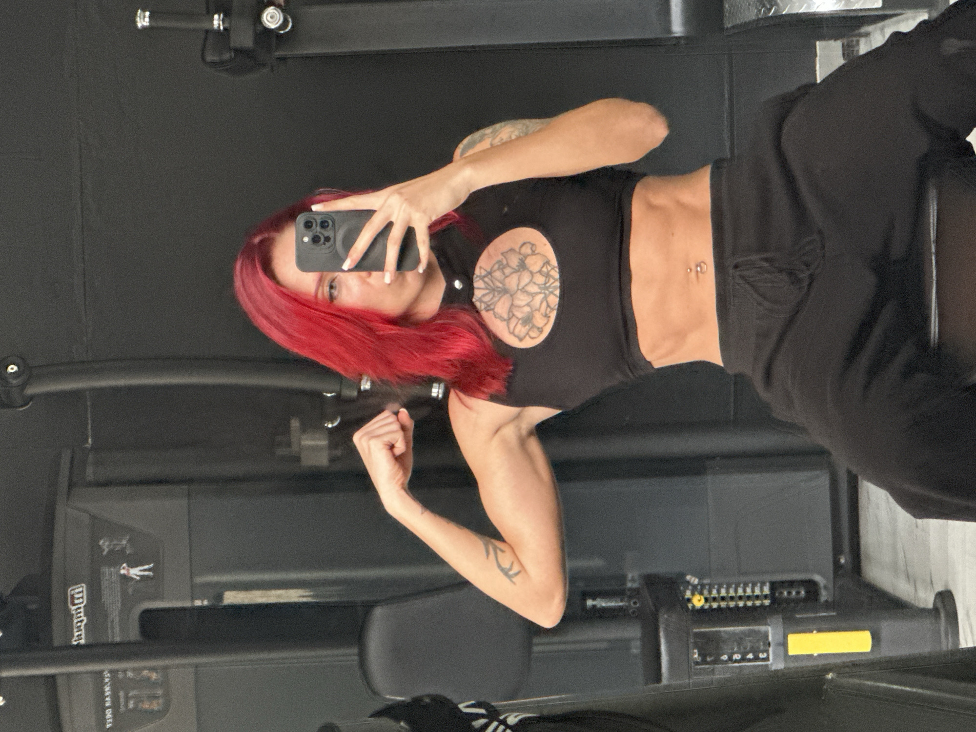 A mirror selfie captures a woman with bright red hair, dressed in a black crop top with a circular chest cutout revealing a floral tattoo, and black sweatpants