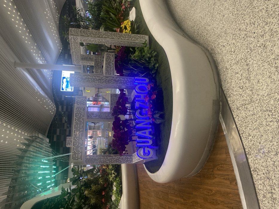 The image depicts an indoor public space, specifically an area within Guangzhou Baiyun International Airport (CAN) in Guangzhou City, China