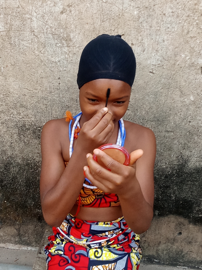 A young African woman with dark skin applies makeup. She wears a black cap and traditional patterned clothing, including a cropped top and a wraparound skirt. Blue and white beaded necklaces adorn her neck. She holds a small round mirror in one hand and uses a mascara wand to apply makeup to her eyebrows. She stands in front of a textured concrete wall.