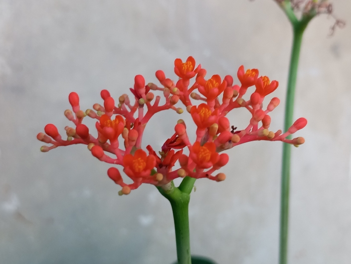 - "A close-up photograph displays a cluster of vibrant red and orange inflorescences, consistent with a Jatropha multifida plant, positioned centrally against a light, uniformly textured background" by FM-5zxmK2, licensed under CC BY 4.0