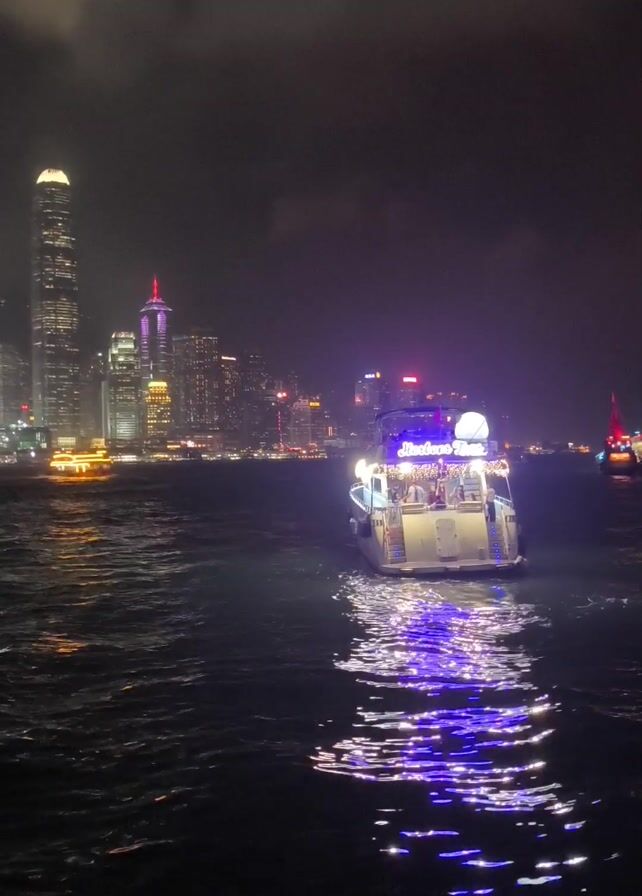 boat on the water at night with city lights in the background. The boat is decorated with bright white lights and a string of purple lights reflected on the water. The city skyline, partially obscured by clouds, features tall buildings with lights, including one with a prominent red light on top. Another boat with yellow lights can be seen to the left, while a boat with red lights is visible to the right.