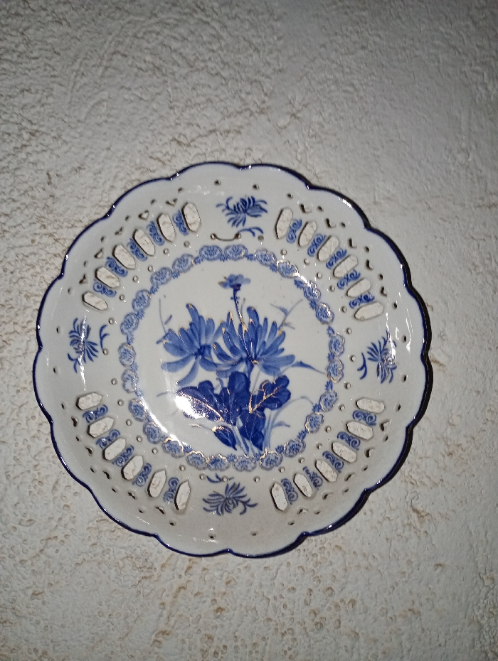 A white ceramic plate with a blue floral design sits on a textured surface. The central design features blue flowers with gold accents. The plate has a scalloped edge with decorative cutouts around the rim. A blue band borders the central design and the outer edge. The plate shows signs of wear, with some minor discoloration.
