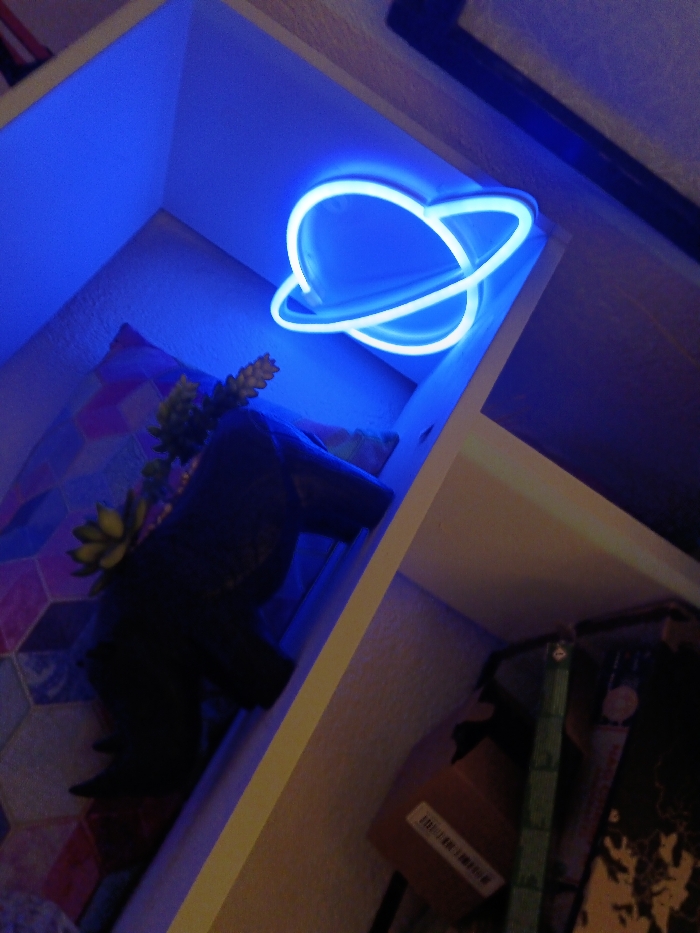 An interior scene is depicted, focusing on a multi-compartment white shelving unit. Within the upper-left compartment, a blue neon sign shaped like a stylized planet with rings emits bright blue light. Directly below the neon sign, inside the same compartment, a dark, indistinct object holds artificial succulent plants with green and yellow-green foliage. The wall behind these items displays a geometric pattern of hexagonal or diamond shapes in blue, purple, pink, and white tones. To the right and below, another compartment of the shelving unit is visible, containing several indistinct dark objects, including a brown box with a white rectangular label on its side. The scene is primarily illuminated by the blue light from the neon sign, casting a distinct blue hue over the immediate environment. No individuals are present, and no specific markers allow for the identification of a precise location within Toulouse, France.