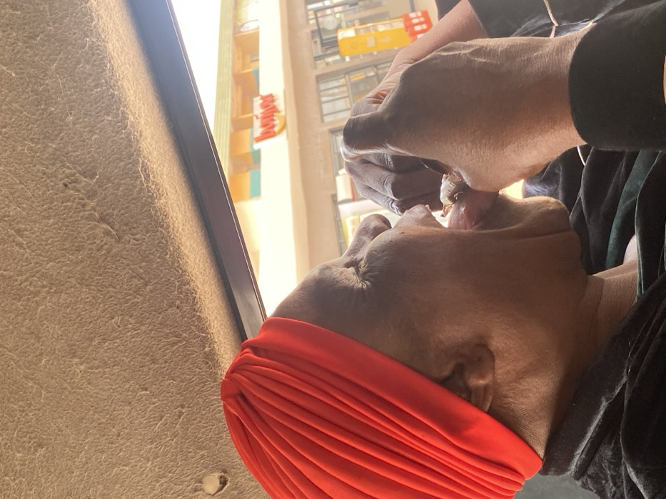 The image captures a scene inside a vehicle, looking out towards a commercial establishment in Shagamu, Nigeria. An individual with dark skin is positioned in the foreground, wearing a vibrant red headwrap and a dark, possibly velvet, garment. Their face is in profile, oriented to the right, with the mouth open and tongue extended. Two dark-skinned hands, featuring dark fingernail polish, are seen manipulating a small, light-colored object and inserting it into the individual's open mouth. Outside the vehicle's window, a building with a multi-colored roof, primarily yellow/gold and teal/green, is visible. A prominent red sign on the building clearly displays the word "Bonjour." To the right of the building, two distinct yellow fuel dispensing units are present. The vehicle's light-colored, textured headliner is visible in the upper portion of the frame.