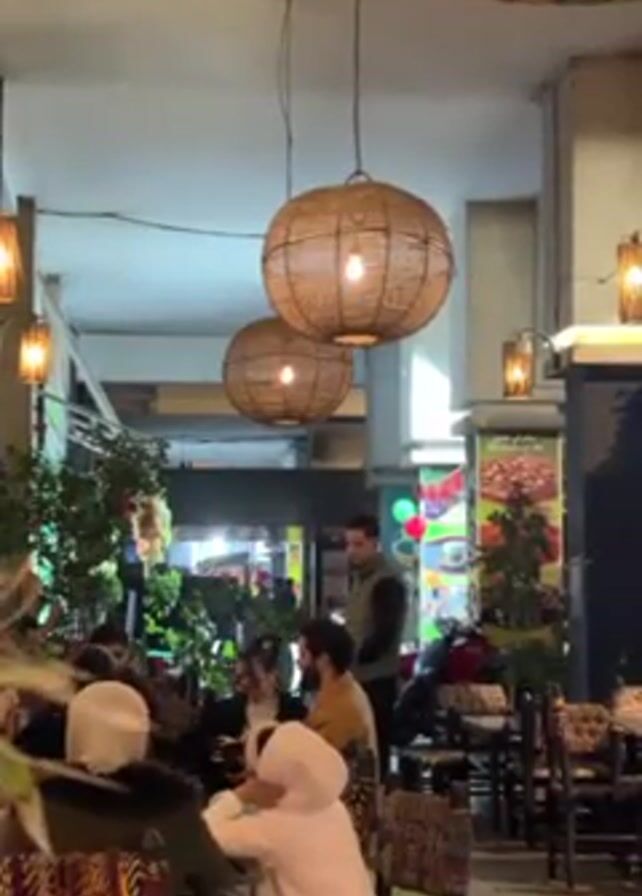 outdoor seating area of a restaurant. Several people are sitting at tables, chatting and relaxing. Some are wearing headscarves. The restaurant is decorated with plants and large, round woven lampshades. Additional lighting is provided by smaller wall sconces. The area appears to be a covered outdoor space or a wide sidewalk beneath a building's overhang. A man in a vest is visible standing near a walkway. The background suggests a city street. Music plays audibly.