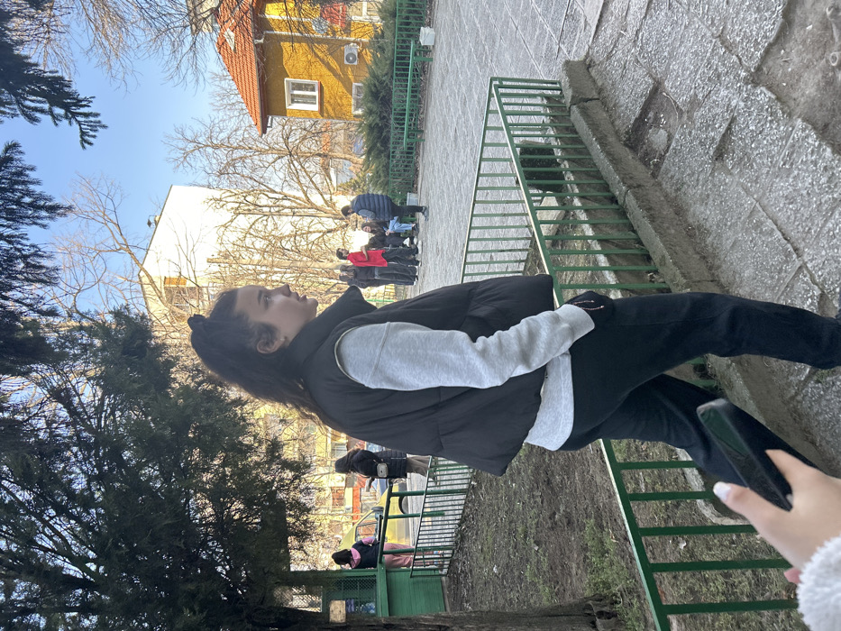 The image portrays an outdoor urban environment in Cherven Bryag, Bulgaria, under clear, sunny skies. In the immediate foreground, from the bottom left, a hand with a light cuff is visible, holding a dark-colored smartphone. A young female, the primary subject, is positioned centrally, captured in profile walking towards the right. She has dark, wavy hair tied partially back, a black puffy vest over a light grey long-sleeved shirt, and dark pants. Her left hand is in her pocket, displaying red beads. A paved pathway, constructed from grey flagstones, extends across the lower portion of the frame. To its left, a low green metal railing separates the pathway from a patch of bare earth. Further left, a dense evergreen tree casts shadows. Behind the railing on the left, a small green kiosk-like structure is partially visible, with a group of 3-4 individuals nearby; one person wears a pink garment. In the mid-ground, towards the right, a larger group of approximately 8-10 young individuals is gathered on a paved area equipped with green benches. Members of this group are standing and seated, with one person distinctively wearing a red shirt and another a blue vest. The background features several buildings and bare deciduous trees. A tall, light-colored multi-story building stands prominently to the left of center, while a smaller, bright yellow house with a reddish-orange tiled roof and an air conditioning unit is visible to its right. A clear blue sky is visible above the structures and trees.