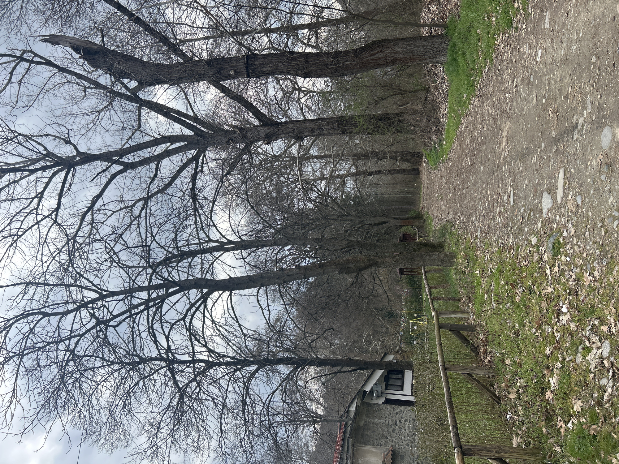 The scene depicts a bare deciduous forest pathway in Parvenets, Bulgaria, under an overcast sky. A dirt and gravel path, strewn with dry leaves and small stones, extends into the distance, bordered by sparse green grass. To the left, a rustic wooden fence made of rough logs runs parallel to the path, backed by a dense line of leafless shrubs. Behind the fence and shrubs, a single-story building with stone walls and a red-tiled roof is partially visible, featuring a dark-framed window with white trim and a white external fixture. Further left and behind the fence, a grassy area contains a yellow metal swing set and a small reddish-brown wooden structure. The pathway is flanked by numerous tall, bare trees with thick trunks and branches. One prominent tree on the right side of the path exhibits a large, jagged break at its top. Another tree trunk on the right features a white, circular object affixed or growing on its surface, secured by a band. No individuals, actions, or interactions are present in the image.