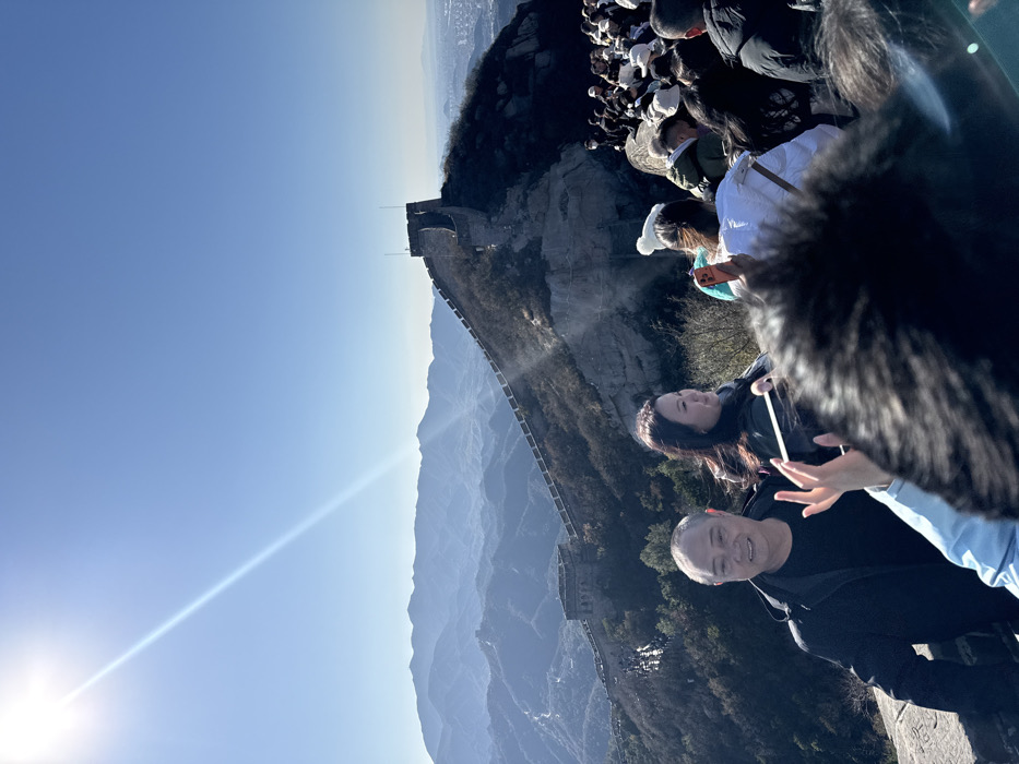 This image presents a detailed view of a crowded section of the Great Wall of China, situated within Yanqing District. Under a clear blue sky with a prominent sun flare from the upper left, the stone Great Wall, punctuated by watchtowers, traverses a series of rugged, vegetated mountain ridges that recede into the distance. In the foreground on the left, an East Asian man with a shaved head and dark jacket smiles directly at the camera. To his right and slightly behind him, an East Asian woman with dark hair, also in a dark jacket, looks towards the right. Multiple hands are visible in the immediate foreground, one holding an orange-cased smartphone vertically. On the right side of the frame, a dense gathering of tourists, primarily East Asian and dressed in layered clothing, occupies a steep segment of the wall or an adjacent pathway. Distant mountains exhibit a blue atmospheric haze, and a faint cityscape is discernible on the far right horizon.