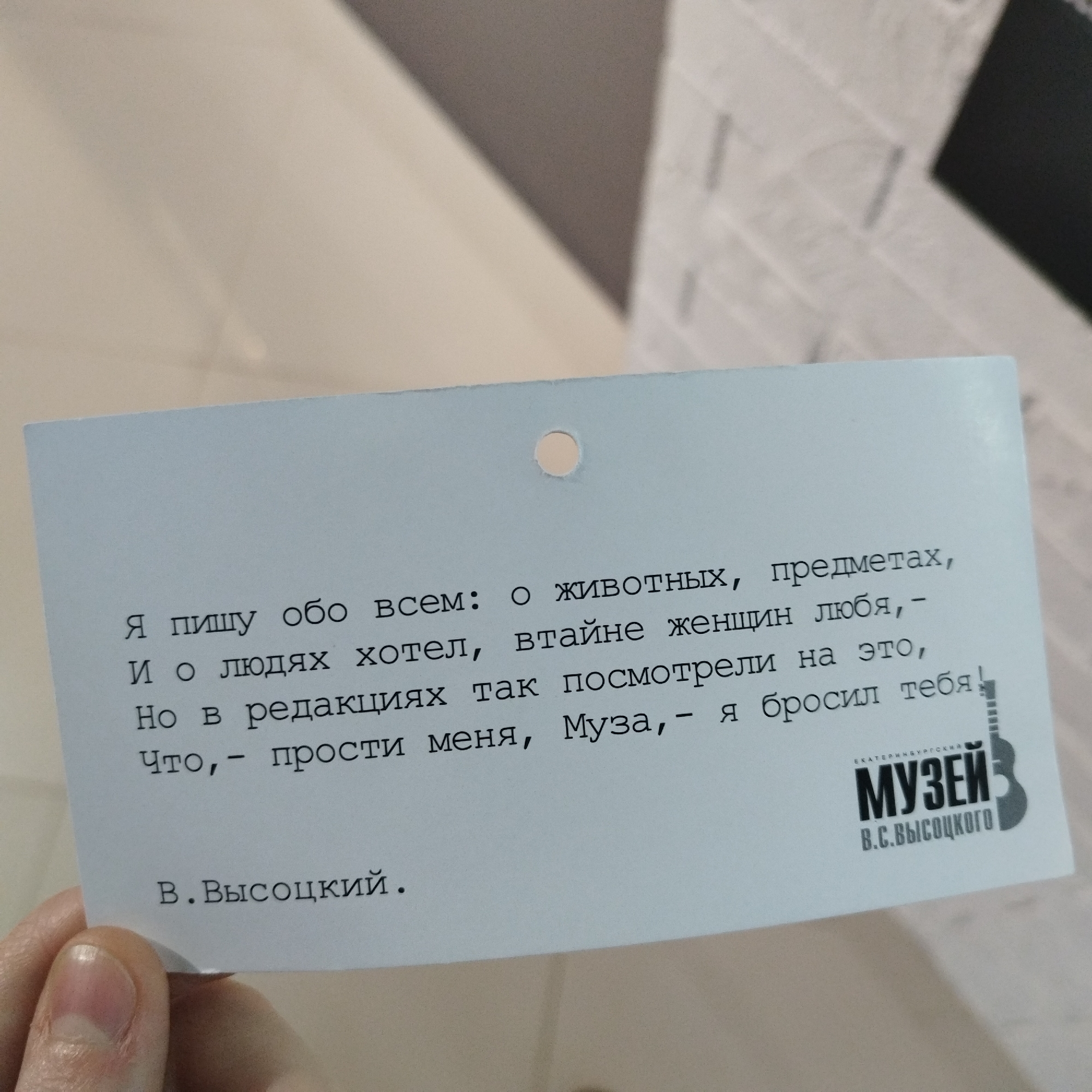 A person holds a light blue card with a quote in Russian, attributed to V. Vysotsky. The quote translates to: "I write about everything: about animals, objects, and about people I wanted to, secretly loving women, But the editors looked at it that way, that - forgive me, Muse, - I left you." The card also features a logo for the V.S. Vysotsky Museum in Yekaterinburg, Russia, indicated by the text "ЕКАТЕРИНБУРГСКИЙ МУЗЕЙ В.С.ВЫСОЦКОГО."