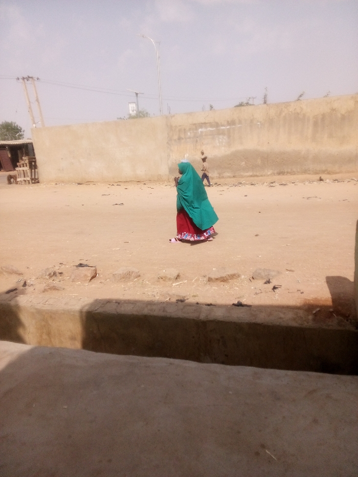 The image depicts an unpaved, dusty street scene in Tudun Murtala, Nigeria, under clear, bright daylight. In the mid-ground, an individual is walking from the right side of the frame towards the left. This person is dressed in a long, bright green head and upper body covering (khimar or hijab) over a long red garment with a patterned border, and light-colored sandals. In the far background, a second individual is visible walking in the same direction, appearing to carry an object on their head. A tall, light-colored concrete or mud-brick wall spans horizontally across the background, showing signs of weathering and dark vertical streaks. To the far left, behind the wall, a rudimentary structure made of wood and corrugated metal is visible, along with a utility pole. A modern street light pole rises prominently in the background, slightly to the left of the center. The ground is uneven, unpaved dirt and sand, littered with small rocks and debris. A dark, low concrete or stone ledge occupies the immediate foreground, partially obscuring the ground closest to the viewer.