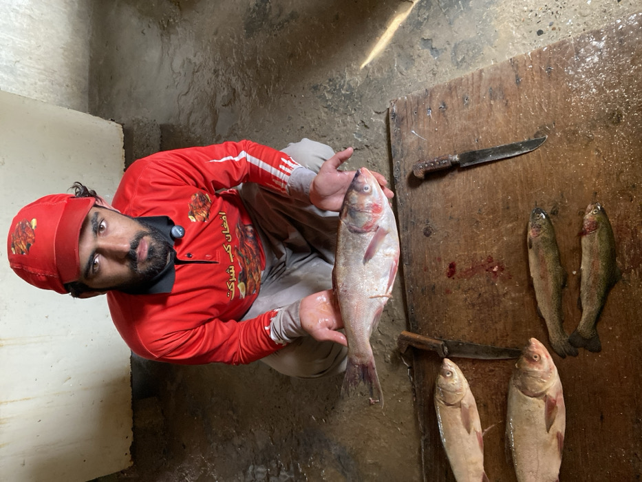 An adult male is captured in an indoor setting, likely a fish processing area, in Deh Sabzi, Afghanistan