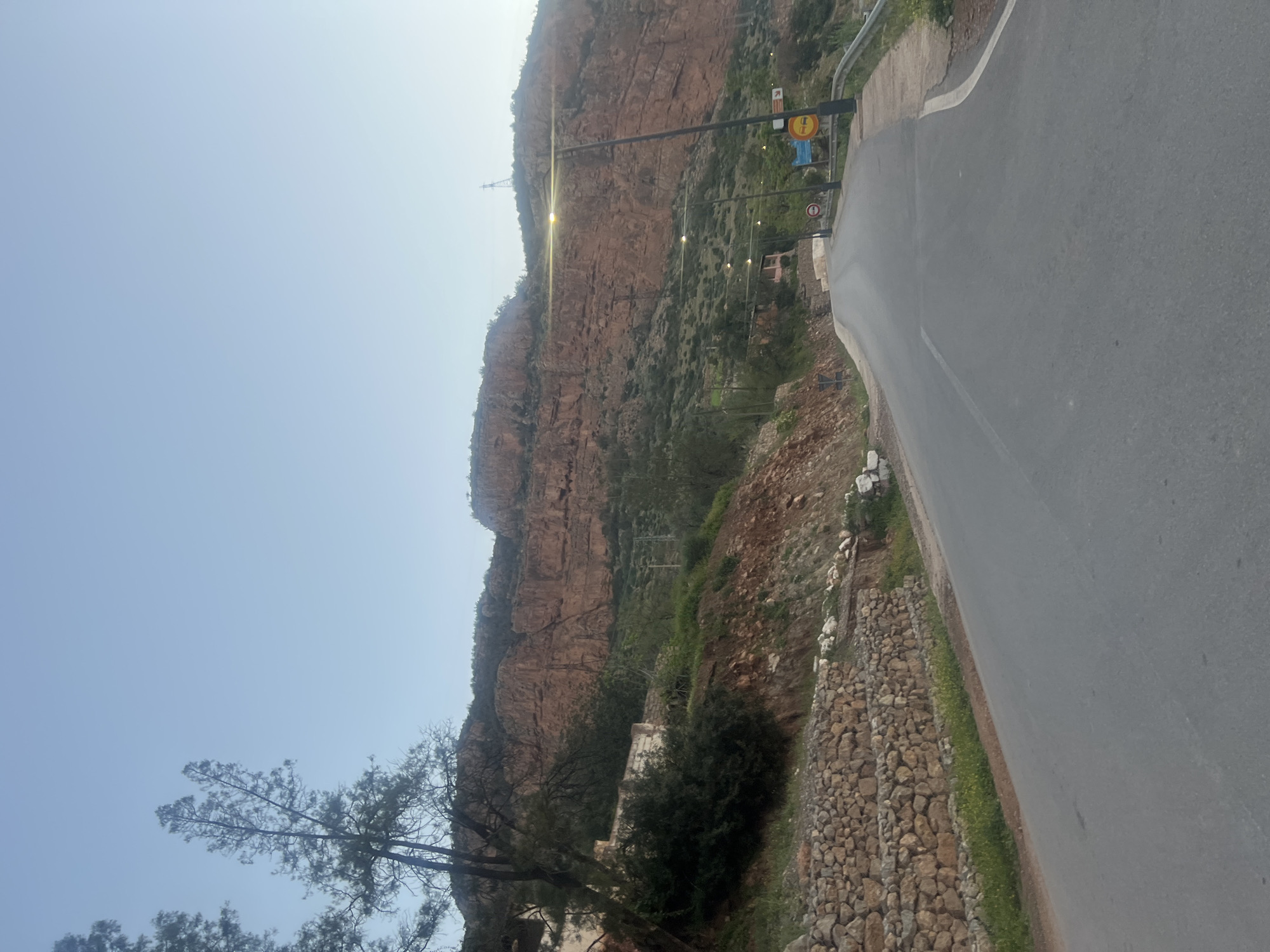 road winding along a hillside in the area of Bin El Ouidane, Morocco. The road surface is gray asphalt. A retaining wall of stacked stones lines the road edge. A steep, rocky mountain face rises in the background with sparse vegetation and some utility poles visible. The sky is pale blue.