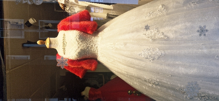 The image displays a retail window display in Lens, France, featuring two mannequins. The primary subject is a headless mannequin adorned with a voluminous white wedding gown and a bright red, short-sleeved, faux-fur shrug. The wedding gown features an intricately embroidered lace bodice and a full, multi-layered skirt of sheer white fabric, embellished with scattered silver snowflake appliques and additional lace patterns. A white snowflake pin is attached to the left shoulder of the red shrug. The mannequin's torso is covered in a cream-colored fabric, topped with a light wooden neck and headpiece. To the left, a partial view of a second mannequin reveals a strapless, floor-length red gown. The display is viewed through a reflective glass window, showing superimposed reflections of an exterior building with light-colored walls and multiple windows, along with interior ceiling structures and spotlights. The overall scene suggests a bridal or formal wear boutique with a winter-themed display.