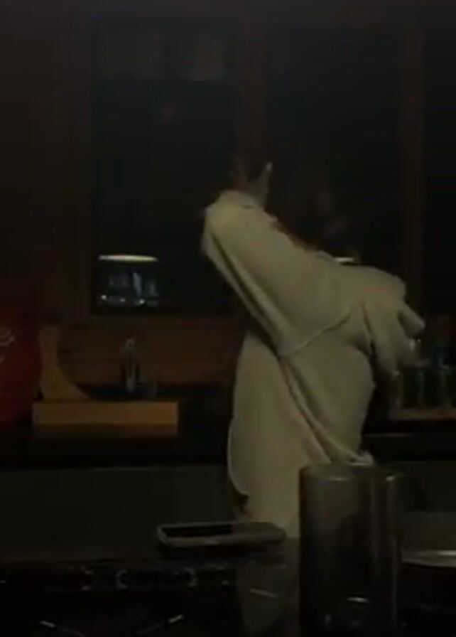 A woman is dancing in a kitchen. She has brown hair pulled back from her face and is wearing a gray hoodie with a Mickey Mouse design. She is smiling and laughing as she dances. Behind her is a window with a view of the night. In front of her is a black countertop with a phone, a glass, and a frying pan on it. The kitchen is dimly lit.