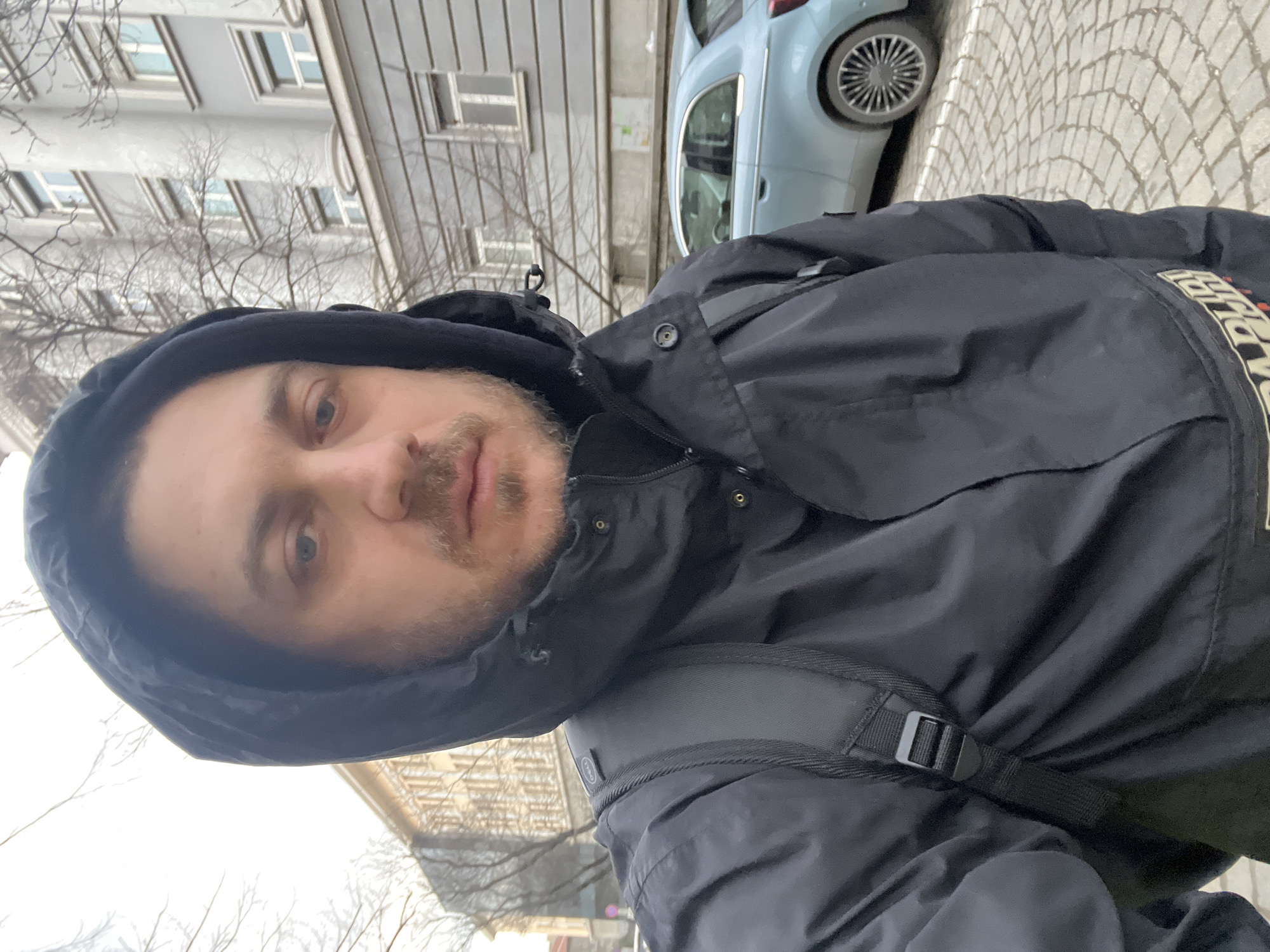 - "An adult male subject with light skin, blue eyes, and light brown facial hair (stubble/short beard) is depicted in a close-up, selfie-style photograph taken outdoors" by FM-Whr5A3, licensed under CC BY 4.0