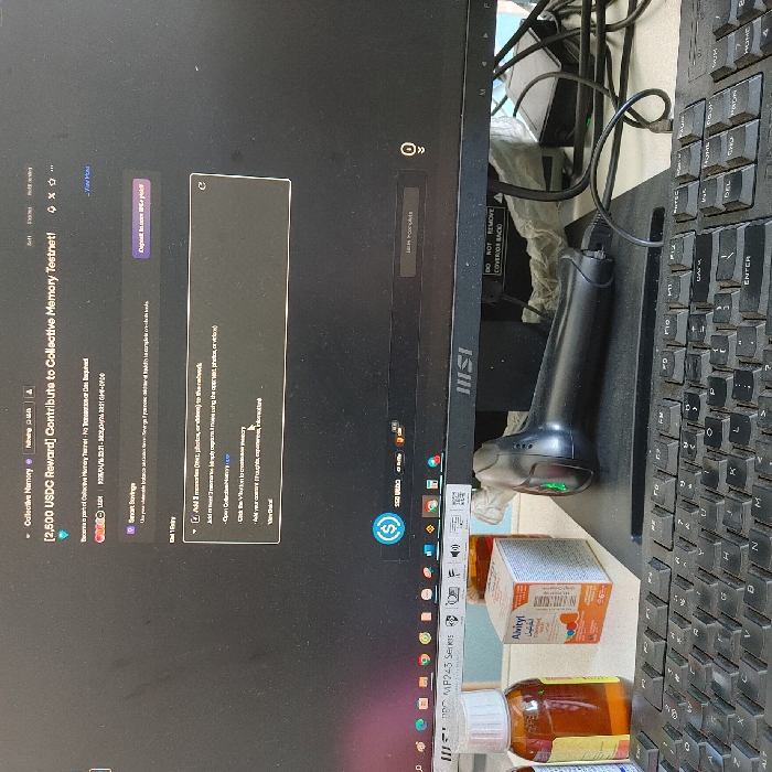 computer monitor displaying a webpage with a title “Collective Memory” and the words “2,500 USDC Reward] Contribute to Collective Memory Teetreet!” in a bright blue box. There is a barcode scanner on a black desk underneath the monitor. Next to the monitor are three small rectangular boxes. There is a keyboard in the bottom right corner. There are two bottles with light brown liquid inside. The bottles are in focus while the rest of the image is blurry. The coordinates 16.064, 108.181 place this scene in Da Nang, Vietnam, the location of the image cannot be further specified.