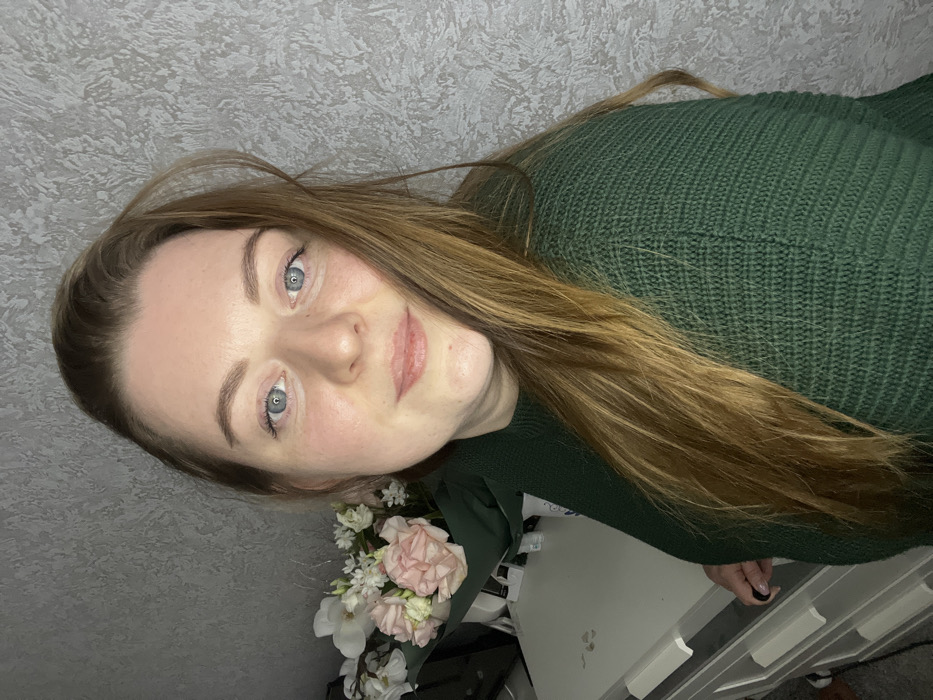 A female subject, appearing to be an adult, is depicted in a frontal medium shot, looking directly at the camera. She has light skin, blue eyes, and light brown hair extending over her right shoulder and chest. She is wearing a dark green, ribbed knit sweater. Her left hand, featuring a dark nail polish, rests on a light-colored dresser located in the lower-left portion of the frame. A bouquet of light pink and white flowers, wrapped in dark green paper, is positioned on the dresser to the subject's left. The background is a textured, light gray wall. The scene is an indoor setting within the city of Раздолье, Russia.