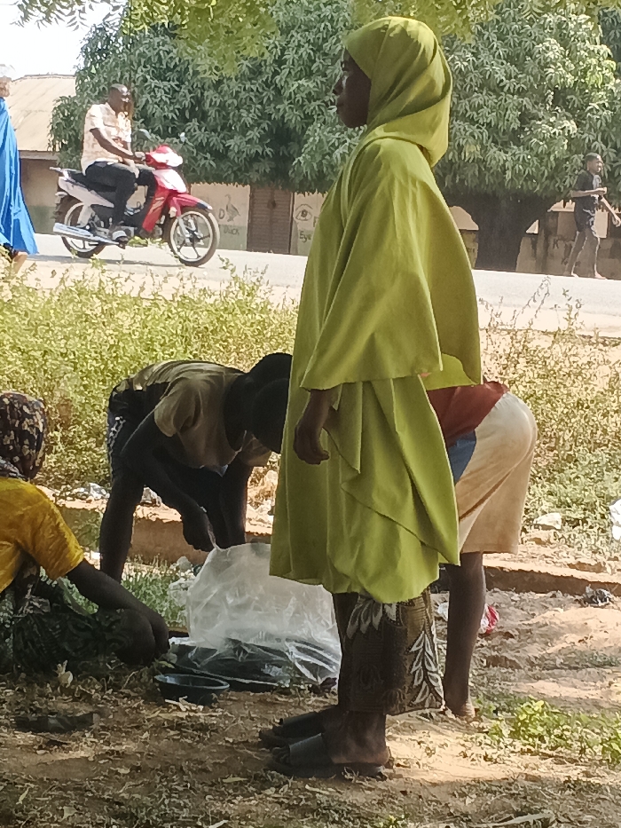 The scene depicts an outdoor urban environment in Doma, Nigeria, under daylight conditions. In the immediate foreground, a person stands facing right in profile, dressed in a lime green abaya and matching hijab, with a patterned brown and white skirt and dark sandals. To the left, a person in a yellow top and patterned head covering is seated or squatting on the dry, dusty ground, near a large white plastic bag. Another individual, wearing a light-colored t-shirt and dark shorts, is bent over the white plastic bag, appearing to handle its contents. Partially obscured behind the standing figure, a third individual in light-colored shorts and a red and blue top is also bent over. Two dark, shallow bowls or containers are visible on the ground near the plastic bag. In the mid-ground, a paved road is visible. A man on a red and silver motorcycle, wearing a light-colored plaid shirt, is driving from left to right. Further along the road, a dark-skinned man in a dark shirt and pants walks from right to left. On the far left, a person wearing a bright blue garment is partially visible. The background features lush green foliage from trees and bushes, and a light-colored building wall with partial signage, including the word "D pack" and a stylized "Eye" graphic. The ground in the foreground is unpaved and sandy, with scattered dry vegetation.