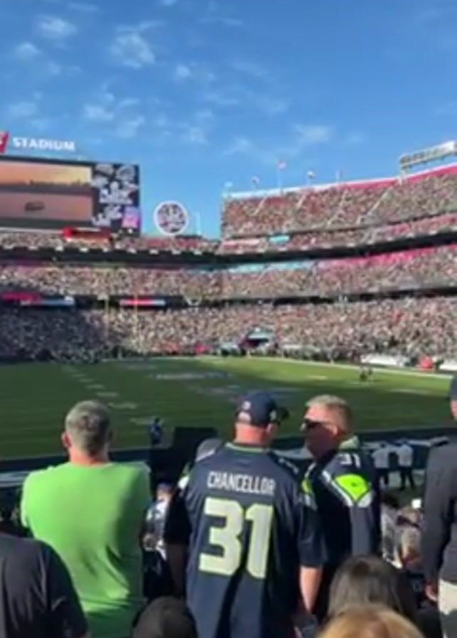 crowd of people at Levi’s Stadium, an open-air football stadium. Most people are standing and facing the football field. A large video screen displays an image of a waving American flag. Several people are wearing Seattle Seahawks jerseys; one jersey has “CHANCELLOR 31” on the back. The sky is blue with some clouds.