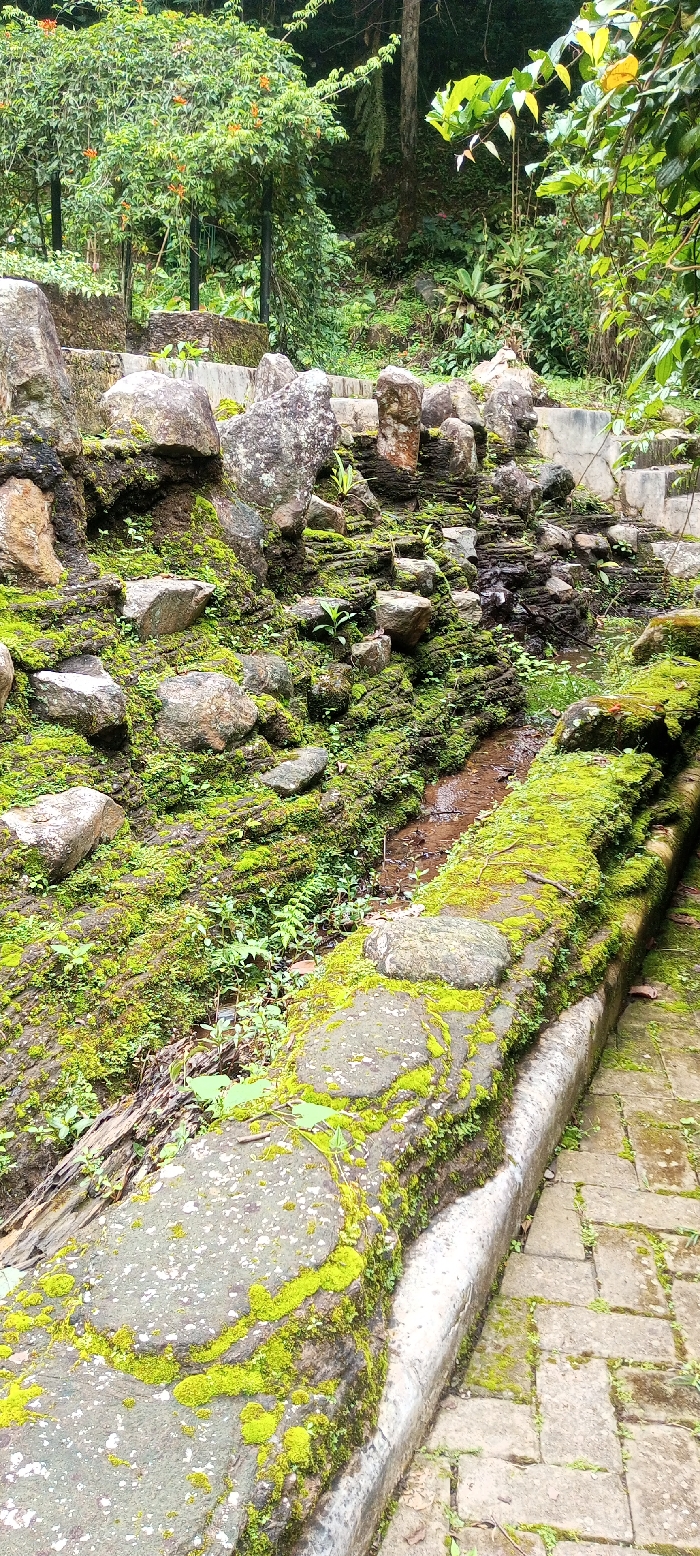 This image depicts a verdant, landscaped water feature within the city of Kanand, India. In the lower right, a paved pathway composed of light-colored rectangular pavers extends diagonally, with small green plants emerging between them. This pathway is bordered on its left by a concrete curb-like structure, heavily covered in vibrant green moss. Above the curb, a large, irregularly shaped stone formation, also extensively coated in moss, defines the right edge of a descending water channel. The central and mid-ground areas are dominated by this multi-tiered water channel, constructed from numerous grey and brown rocks of varying sizes. The rocks and surrounding surfaces are thickly blanketed in bright green moss, interspersed with small ferns and other herbaceous plants. A narrow, shallow stream of brown water flows downhill through the channel. The background consists of dense green foliage, primarily trees and shrubs, filling the upper portion of the frame. Some plants within the foliage exhibit small orange flowers. Dark vertical support posts are partially visible among the vegetation in the upper left section. No people or animals are visible in the scene. The environment appears humid and is illuminated by natural light.