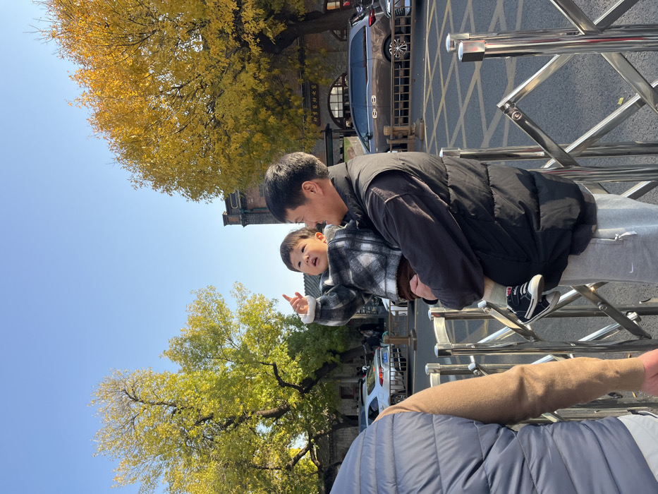 The image depicts an outdoor scene in Dongcheng District, China, under a clear blue sky and bright sunlight, indicating fair weather. Large trees with yellow and yellow-green foliage suggest an autumn setting. In the foreground, a collapsible metal barrier separates the viewer from the main subjects. A male East Asian adult, wearing a dark long-sleeved shirt, a black puffer vest, and grey sweatpants, is holding a young East Asian child. The child is dressed in a grey and white plaid, fleece-lined jacket, brown pants, and black sneakers. The child is pointing upwards with their right index finger and looking up with an open mouth. The adult is observing the child. On the extreme left foreground, the upper torso and right arm of another individual, wearing a blue puffer vest over a light brown long-sleeved shirt, are visible, facing away from the camera. In the background, a street with yellow grid markings on the asphalt is visible. Several vehicles are present, including a silver sedan and a dark grey minivan. Behind the street, traditional-style brick buildings with dark tiled roofs and arched windows are observed. One building displays a dark sign with Chinese characters, partially obscured.