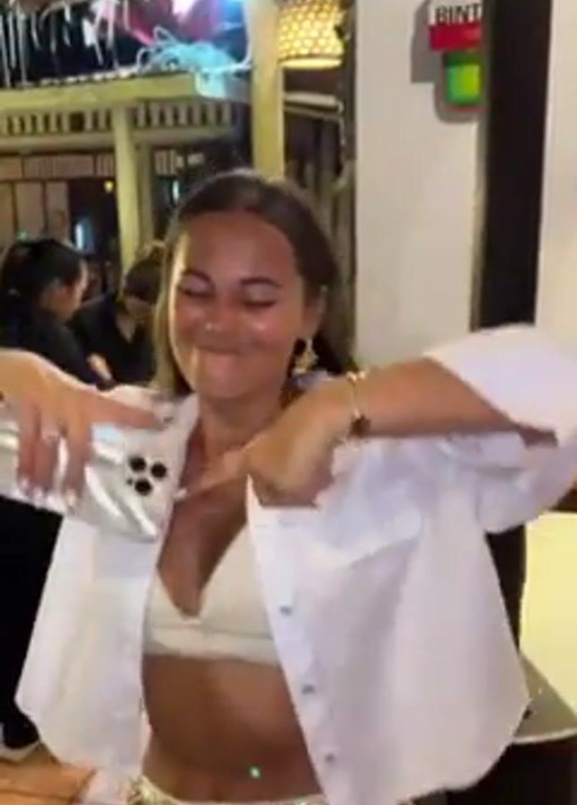A video shows a group of people at an outdoor bar. A woman with brown hair is dancing and gesturing with her hands. She is wearing a white crop top and a patterned skirt. There is a man in the background who is adjusting a gray headband. The bar has a sign with the menu, a Bintang beer sign, and other decorations. Other people are seen seated at the bar, talking and laughing. The video appears to be taken at night.