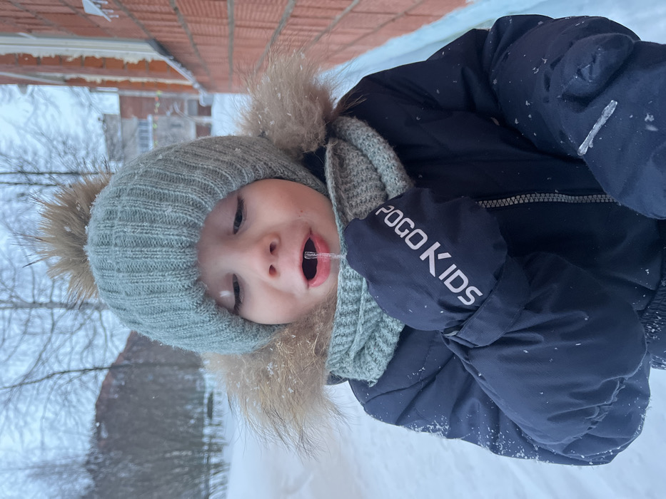 The image captures a young child outdoors in a winter urban setting, likely within Izhevsk, Russia