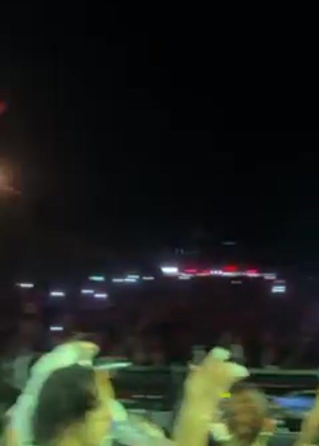 large crowd of people at an outdoor concert or festival at night. The audience is facing a stage and raising their hands in the air, illuminated by bright lights and pyro effects. A DJ appears to be performing on the stage, with the crowd lit up in the background. The stage backdrop flashes with red and blue geometric designs. The concert appears lively and energetic.