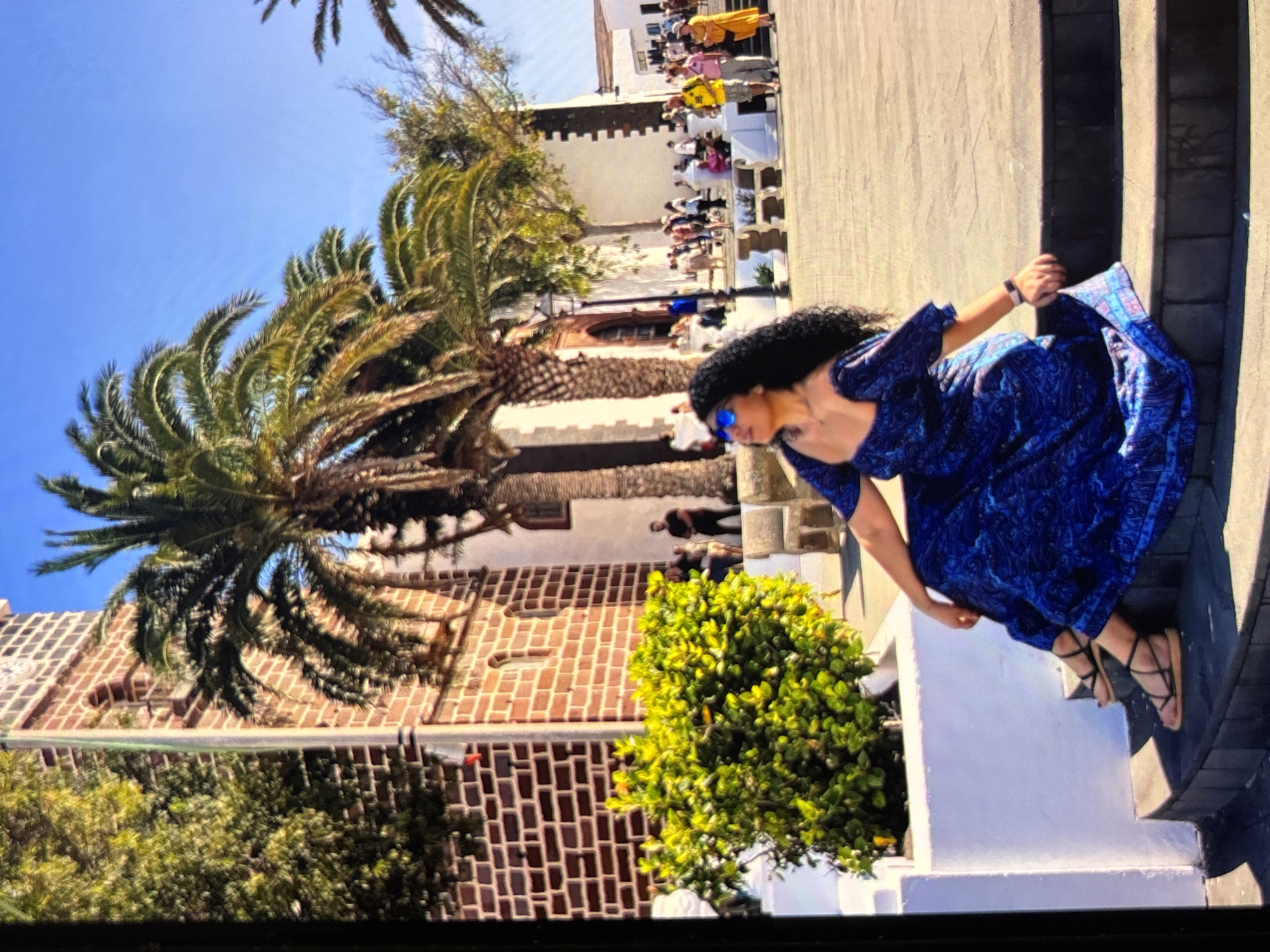 woman in a blue patterned dress and sandals standing in front of a white building with black trim, possibly a church or historical building, with a palm tree and other vegetation nearby
