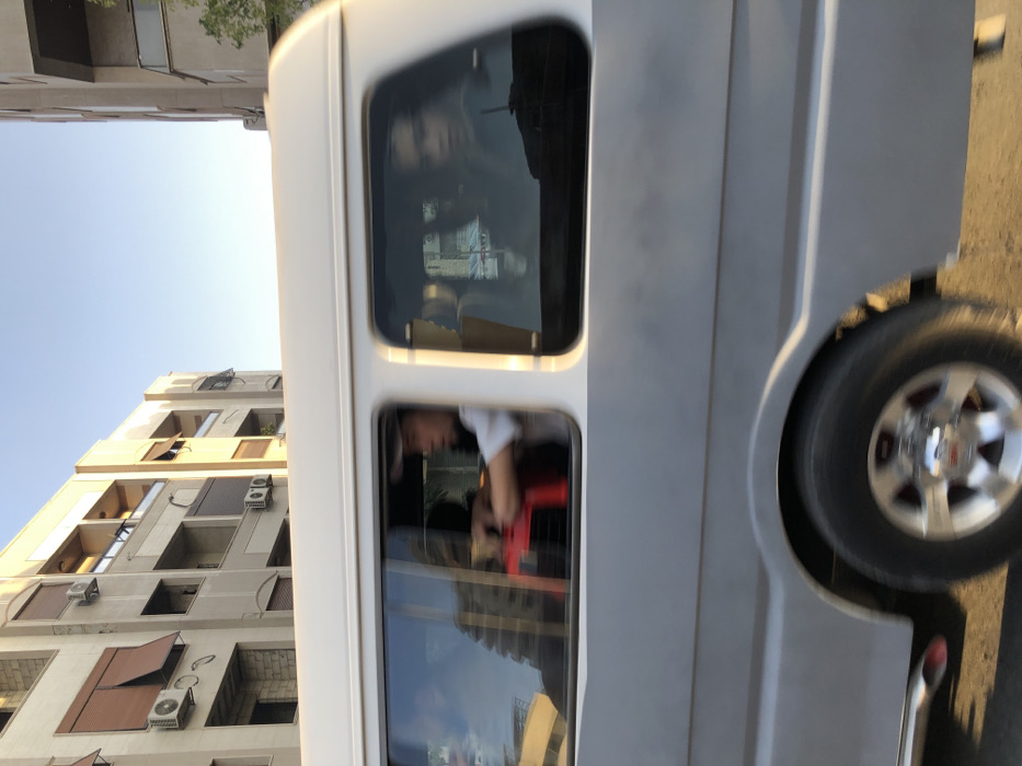 A two-tone utility van, featuring a white upper body and a light grey lower body, is depicted in motion on an asphalt road in Kafr Sousa Municipality, Syria. The scene is illuminated by natural daylight under a clear blue sky. Motion blur is evident across the vehicle's lower section and the background, indicating active transit. A chrome exhaust pipe protrudes near the visible rear wheel, which has a silver alloy rim and a red center cap. Within the van, a male occupant, wearing a white shirt and a light-colored baseball cap, is visible through a front-side window, holding a distinct red, rectangular object. Further back, a second individual with dark hair is partially visible through another side window, seemingly looking forward. The urban environment behind the van consists of multi-story residential apartment buildings. These structures are characterized by light-toned facades, multiple balconies, several closed or partially open brown roller shutters, and numerous externally mounted air conditioning units. Exposed concrete blockwork is discernible on parts of the left-side building.