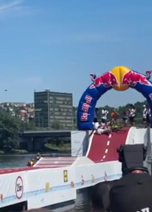 Here is a forensic description of the video: The video shows an event that involves a ramp over water, branded with Red Bull. People are on the ramp. One person appears to attempt to ride down on a bicycle but falls. They slide down the ramp into the water, along with the bicycle. A crowd is present, suggesting this is a public event. The sky is blue and weather is clear. Buildings are visible in the background across the river.