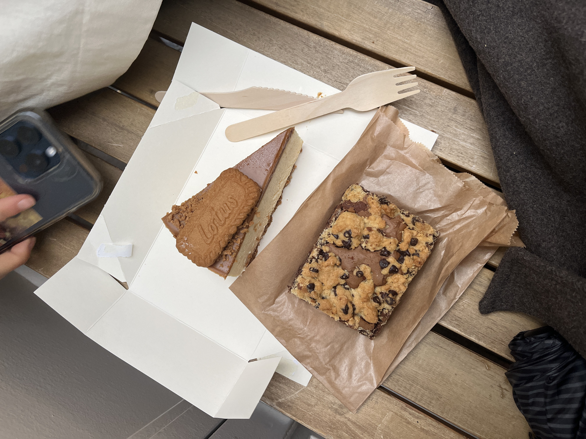 wooden table setting with a white handbag and a phone to the left, and a dark gray fabric to the right. A white open box contains a slice of Lotus Biscoff cheesecake with a wooden knife and fork on top. Next to the box, a chocolate chip cookie brownie sits on a brown paper bag. The photo was possibly taken in Lyon, France.