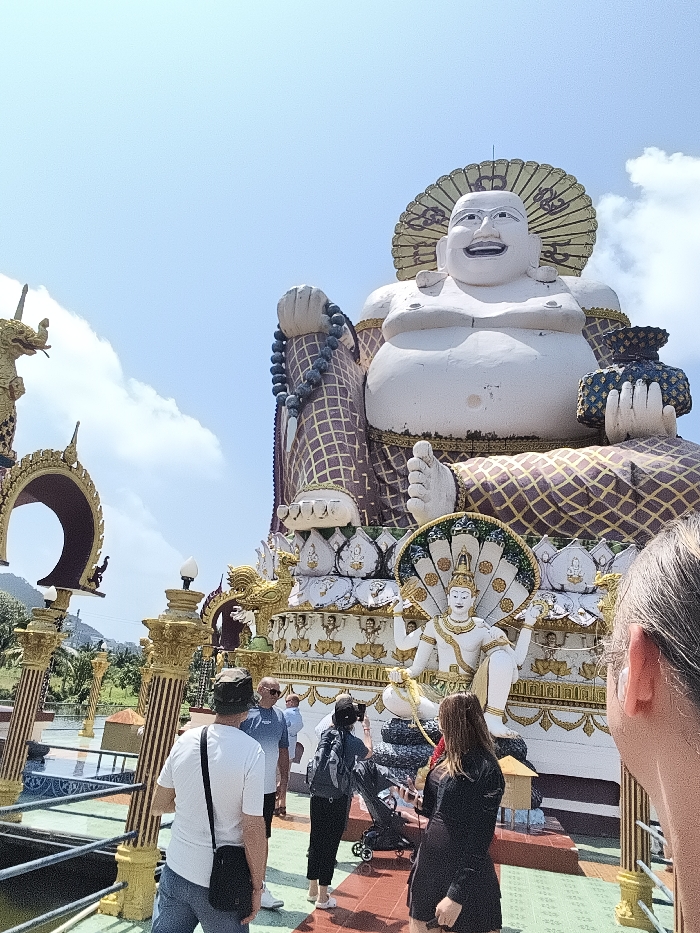 A large, white, smiling Buddha statue dominates the scene