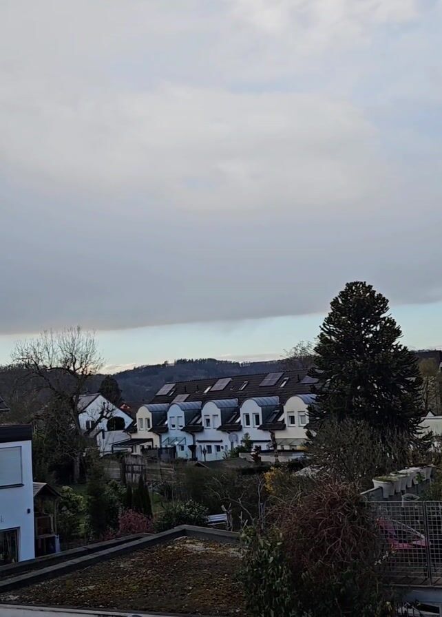 The camera pans up over a row of houses with solar panels on their roofs towards a hill covered in trees. The sky is cloudy and gray.