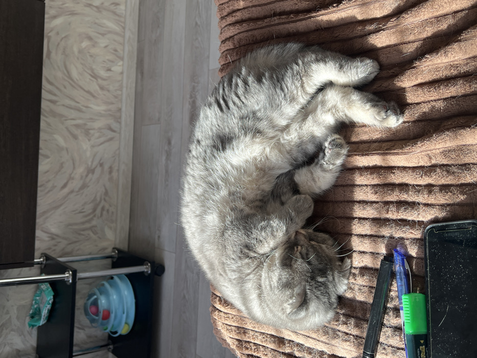 An indoor scene in Votkinsk, Russia, displays a light grey tabby cat curled up and sleeping on a textured brown blanket or rug