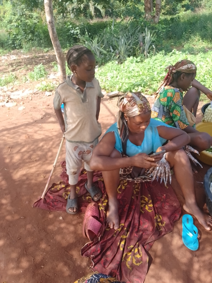 This image captures an outdoor scene in Ejule, Nigeria, featuring three individuals on reddish-brown earth. On the left, a young child stands facing right, wearing a light-colored polo shirt, white shorts with a teddy bear pattern, and dark sandals. They hold a light-colored stick in their right hand. Adjacent to the child, an adult female squats on a maroon patterned cloth spread on the ground. She wears a light blue top and a patterned headwrap, and is barefoot. She holds a dark mobile phone in her left hand and a cluster of peeled, elongated white food items in her right hand, which rests between her knees. A single light blue flip-flop is on the ground near her right foot. To the right and partially obscured, a third individual sits, dressed in a green, yellow, and red patterned top with a headwrap, actively processing yellow food items in a dark bowl. The background shows dense green foliage and trees under direct sunlight.
