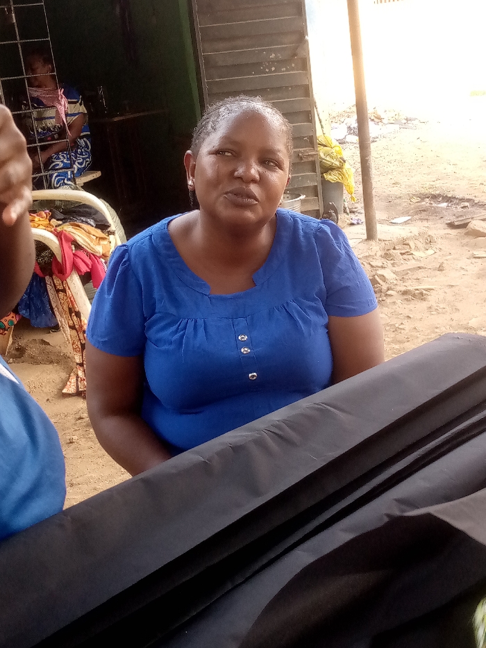 An outdoor scene in Maigizo, Nigeria, features a woman in a blue short-sleeved top with four silver buttons, positioned centrally
