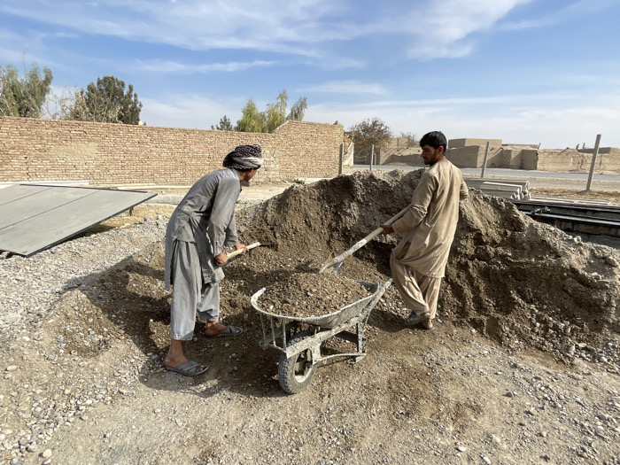 At an outdoor construction site in Nakhonay, Afghanistan, two adult males are engaged in manual labor
