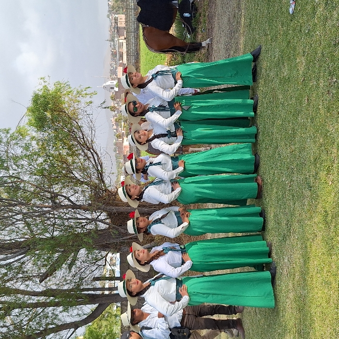- "A group of women wearing traditional Peruvian clothing, including white blouses, green skirts, and hats with a small flower accent, stand in a line outdoors" by FM-b0Aw43, licensed under CC BY 4.0