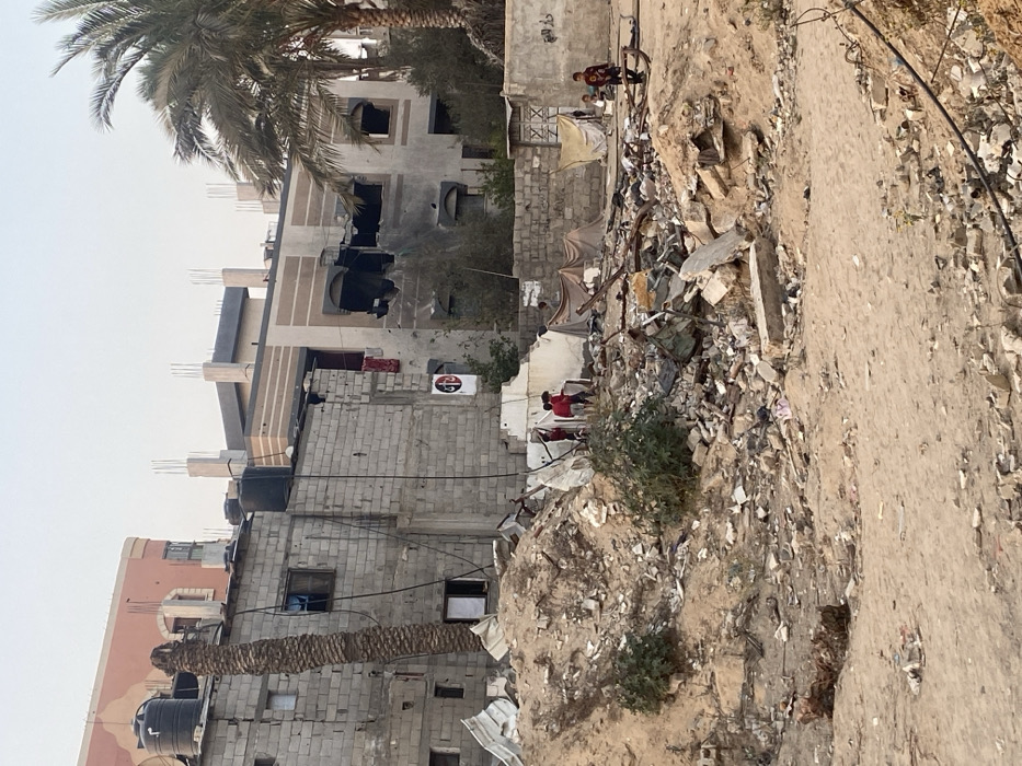 This image captures a devastated urban landscape in Khan Yunis, Palestinian Territory, under a clear daytime sky. The foreground and midground consist of unpaved, uneven ground covered extensively with concrete rubble, twisted metal fragments, and various debris. Scattered low-lying green shrubs punctuate the debris-strewn terrain. In the midground, near a partially collapsed white wall, three individuals, two wearing red shirts, are visible standing amidst the rubble. Further to the right, two additional individuals, appearing to be children, stand near a makeshift shelter crafted from tarps or fabric; one is positioned beside a two-wheeled object, possibly a bicycle or cart. The background features multiple damaged multi-story buildings. On the left, a structure constructed of grey concrete blocks displays broken windows and exposed rebar on its roof, which supports black plastic water tanks. A bare, truncated palm tree trunk leans against this building. Adjacent to it, another building with a beige and brown striped facade on its upper stories shows extensive damage to its lower floors, characterized by large gaping holes, missing window frames, and significant black scorch marks, indicating fire or explosion damage. A red piece of fabric hangs from a damaged opening, and a white banner with a red and black symbol is affixed to a lower wall segment. Exposed rebar projects from the roofs of these damaged structures. A large palm tree with green fronds is visible on the far right, partially obscuring the damaged buildings.