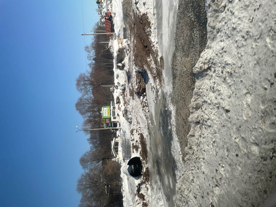 The scene depicts a snow-covered, undeveloped area in Oktyabr'skii, Russia, under a clear blue sky. In the foreground, a large corrugated metal culvert pipe rests horizontally, partially submerged in a pool of murky, partially frozen water. Surrounding the culvert and extending towards the viewer are irregular mounds of dirty snow, brown earth, gravel, and ice. In the midground, additional snow-covered earth piles and construction debris are visible, including a large, partially snow-covered rectangular concrete block. A white bus, possibly decommissioned or parked, is situated behind these mounds, near a street light pole. To the left of the bus, a small building with a light-colored facade and dark roof is present. Two billboards stand prominently: one green with the Russian word "РУМЛЕС" (RUMLES) and the number "900" in white text, and another with blue text to its left. The background features a dense line of bare deciduous trees, indicating a winter season. To the far right, a red dump truck is positioned on an elevated, snow-covered mound of material. Utility poles and power lines are visible on the right side of the frame. No individuals are present in the image.