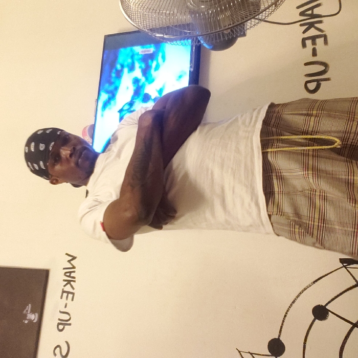 This image depicts an indoor scene in Okpanam, Nigeria. An adult male stands centrally, facing the viewer with his arms crossed over his chest. He wears a black bandana with white markings, a white short-sleeved t-shirt, and beige plaid shorts with a yellow drawstring. Tattoos are present on both forearms. The white wall behind him features black text, including "WAKE-UP" rendered backward on the left and partially on the lower right, and a graphic resembling musical notes on the lower left. A dark-framed art piece depicting a white silhouette is mounted on the upper left wall. A flat-screen television is mounted on the wall to the subject's right, displaying a bright blue and white abstract image. A metallic electric fan is partially visible on the far right, near the television.