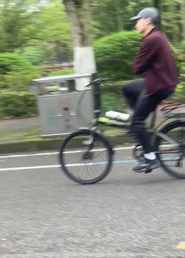 person riding a folding bicycle on a paved road. The person is wearing a dark jacket, dark pants, white socks, and a baseball cap. The bicycle is black with a rear rack. The road has white lines marking lanes. Trees and greenery line the side of the road. The camera follows the cyclist as they move from left to right.