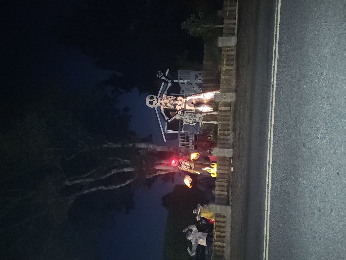 An outdoor night scene in Lakewood, United States, depicts a residential property adorned with illuminated Halloween decorations. In the foreground, an asphalt road with two solid white dividing lines spans the width of the image. Behind the road, a low wooden fence with intermittent concrete-colored pillars separates the street from a yard display. The yard features several large, static figures: on the right, a towering white skeleton figure, seemingly lit from within, stands erect. To its left, a smaller, unlit skeleton is positioned. Further left, a figure with a red glowing head or eyes emits orange, flame-like illumination from its base. To the far left, a white-clad figure with raised arms, possibly a zombie or ghost, is visible. Various smaller, amber-orange lights, resembling fire or lanterns, are scattered among the decorations. In the background, a light-colored structure with a porch and railing is partially visible. Dominating the upper background is a large, dark deciduous tree with multiple trunks, silhouetted against the dark night sky. The overall scene is dimly lit by the decorative elements.