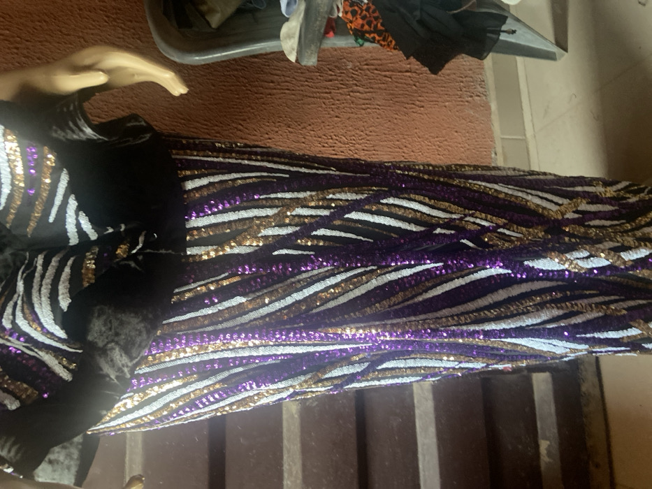 - "A mannequin displays a black, form-fitting dress adorned with wavy, horizontal bands of shimmering sequins in silver, gold, and purple" by FM-fraEP2, licensed under CC BY 4.0