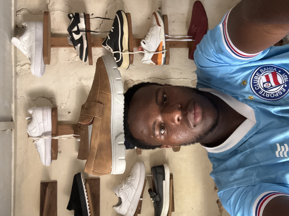 A dark-skinned male subject, approximately 20-30 years old, is depicted in a selfie, looking directly at the camera. He wears a light blue short-sleeved jersey with a white collar and striped sleeves, bearing the "ESPORTE CLUBE BAHIA 1931" crest on the left chest. The background consists of a light-colored, roughly textured wall, which displays multiple pairs of shoes on individual small wooden shelves. Arranged on the wall are approximately eleven distinct shoes or pairs of shoes. These include several white sneakers (resembling Nike Air Force 1s), black and white sneakers (resembling Nike Dunks), black slip-on shoes, black loafers with white soles, white/orange/brown sneakers (resembling Nike Air Jordan 3s), and a prominent pair of tan boat-style shoes with thick white soles positioned centrally above the subject's head. The setting suggests a shoe display, likely within a retail space or a personal collection in the city of Jos, Nigeria.