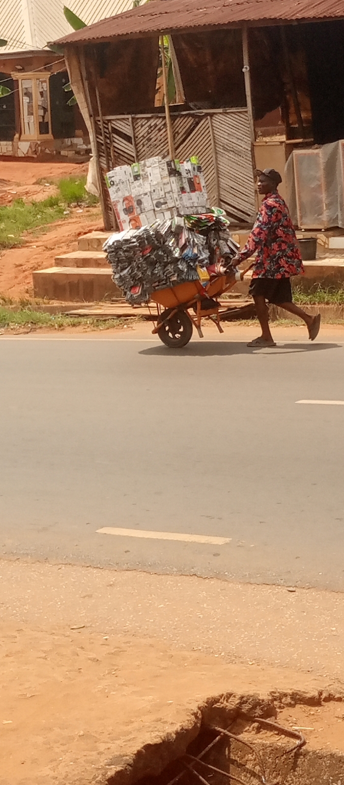 The image portrays an outdoor scene in Nkpor, Nigeria. An adult male is depicted in profile, moving from right to left across the frame, pushing a heavily loaded orange wheelbarrow on an asphalt road. The individual wears a black cap, a patterned long-sleeved shirt, dark shorts, and flip-flops. The wheelbarrow is piled high with numerous packaged commercial goods, predominantly visible as stacks of items like headphones and other electronics accessories. To the right of the individual, a makeshift commercial stall with a corrugated metal roof and slatted wooden walls is visible. Further back and to the left, another building with a white corrugated roof and a distinct window frame stands. The ground bordering the asphalt road is reddish-brown earth. A set of reddish-brown concrete steps ascends from the dirt on the left side, behind the wheelbarrow. The asphalt road itself shows faint white dashed lane markings. In the immediate foreground on the bottom-right, an open ditch or damaged concrete section exposes bent metal rebar.